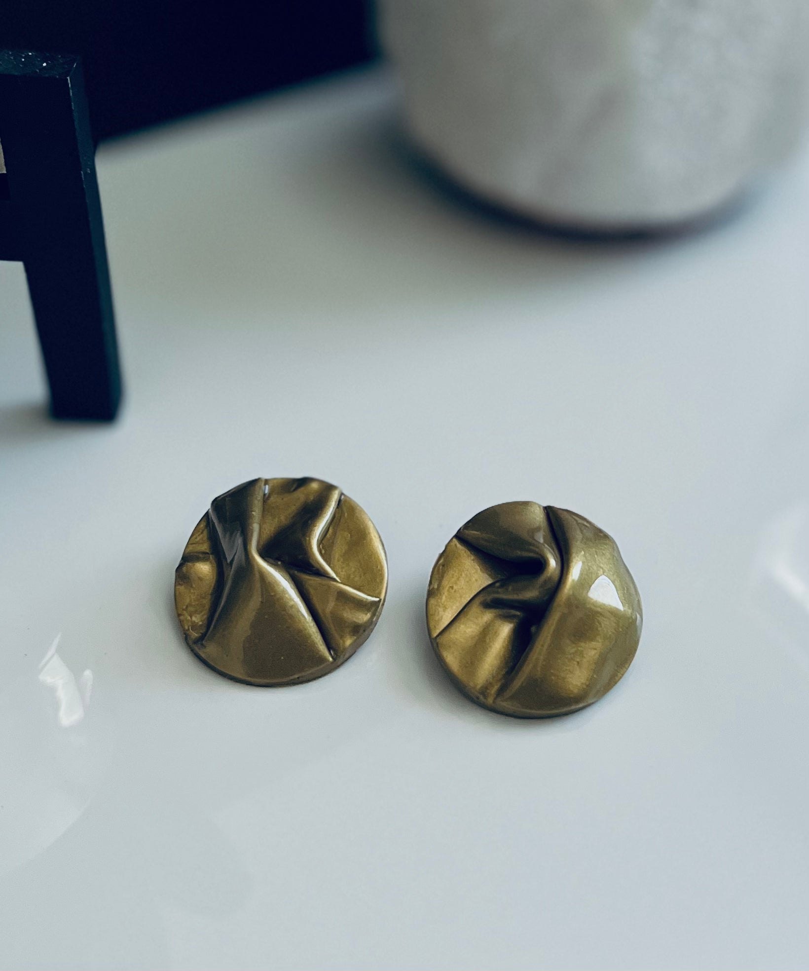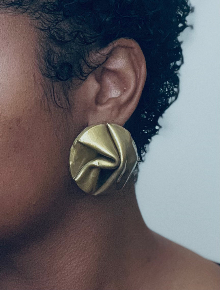 Lightweight polymer clay earring featured in a round drape style and a resin overlay. 100% hand designed. Gold plated earring post used. Available in clip on.