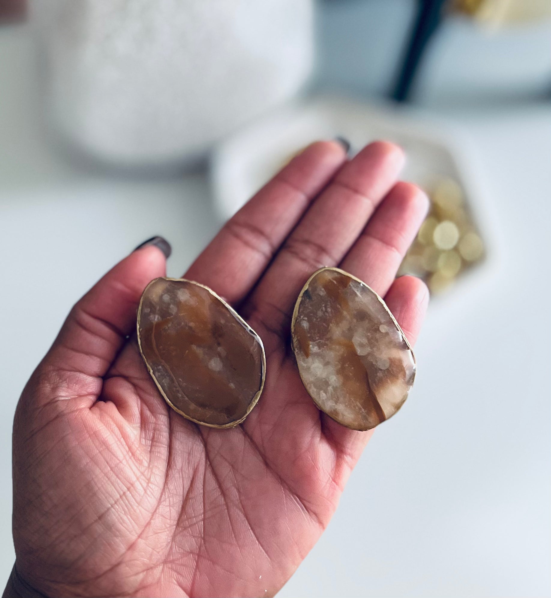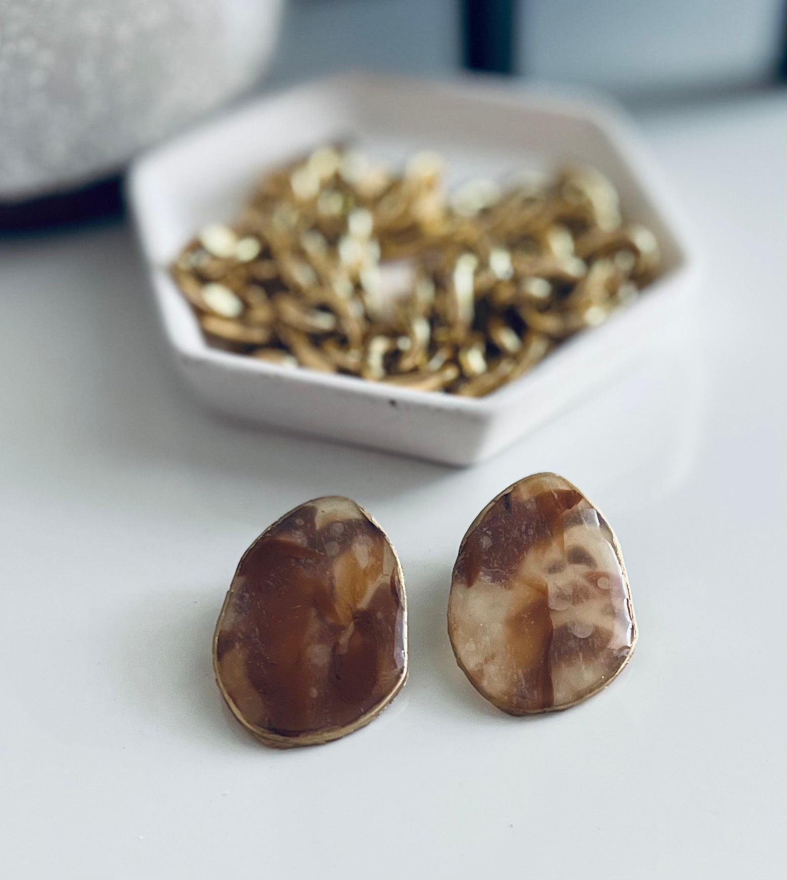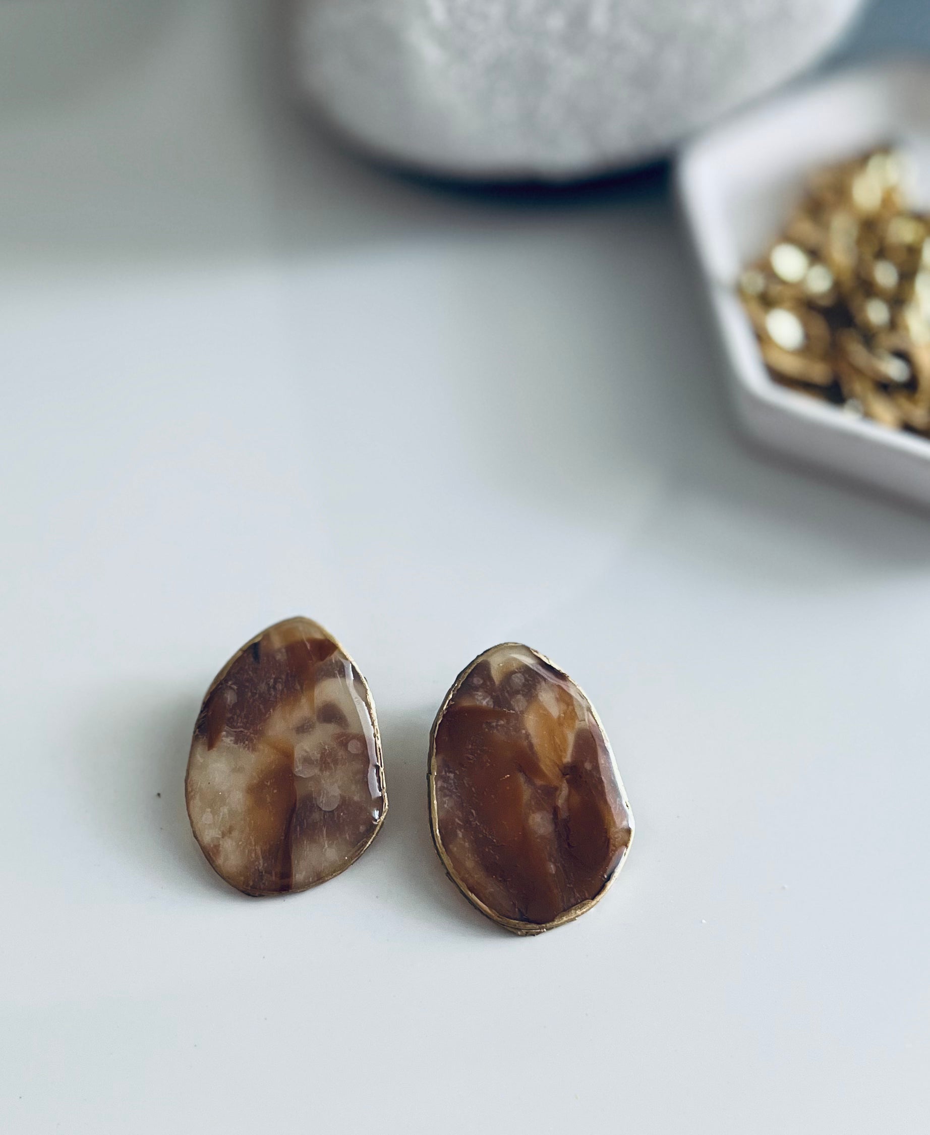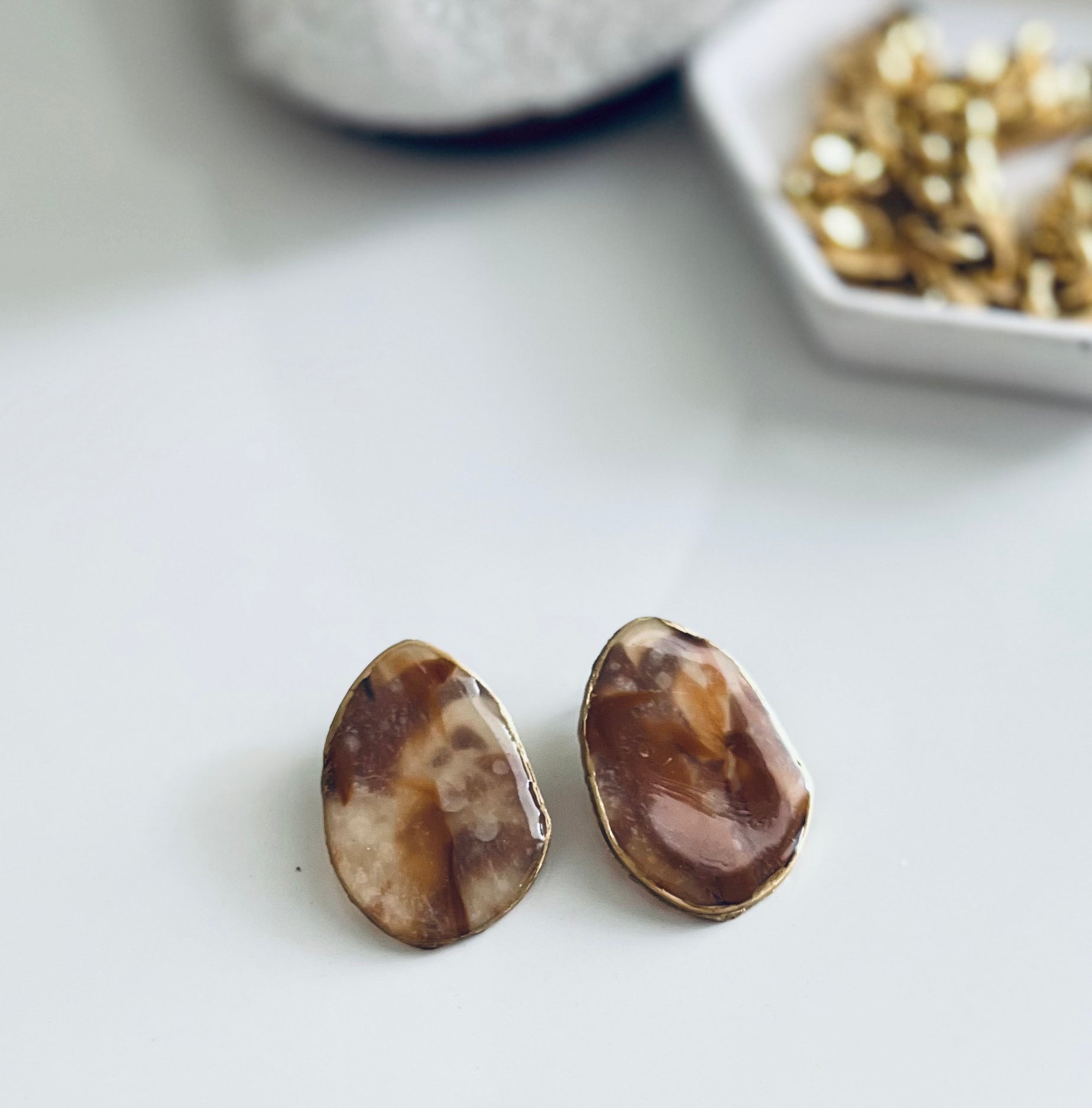 This beauty is featured in a faux stone design and a hand painted gold rim with a resin finish! Features a gold plated earring post.