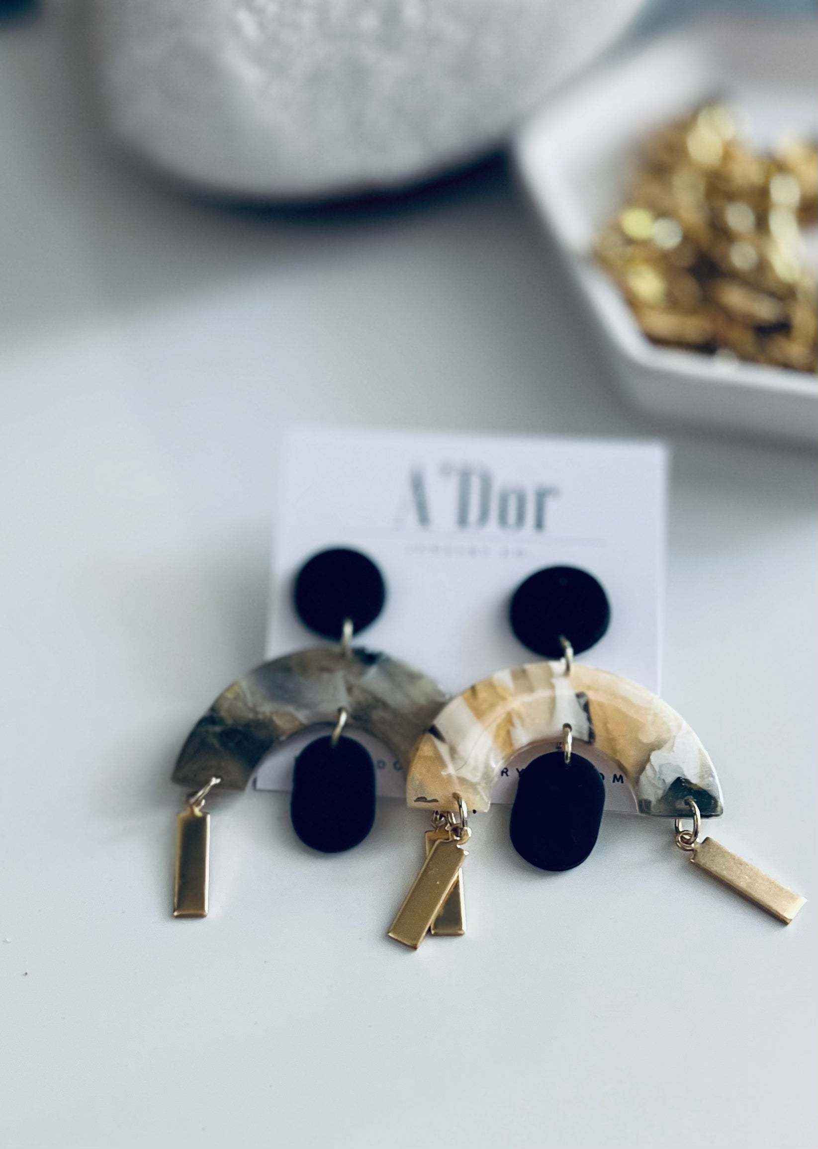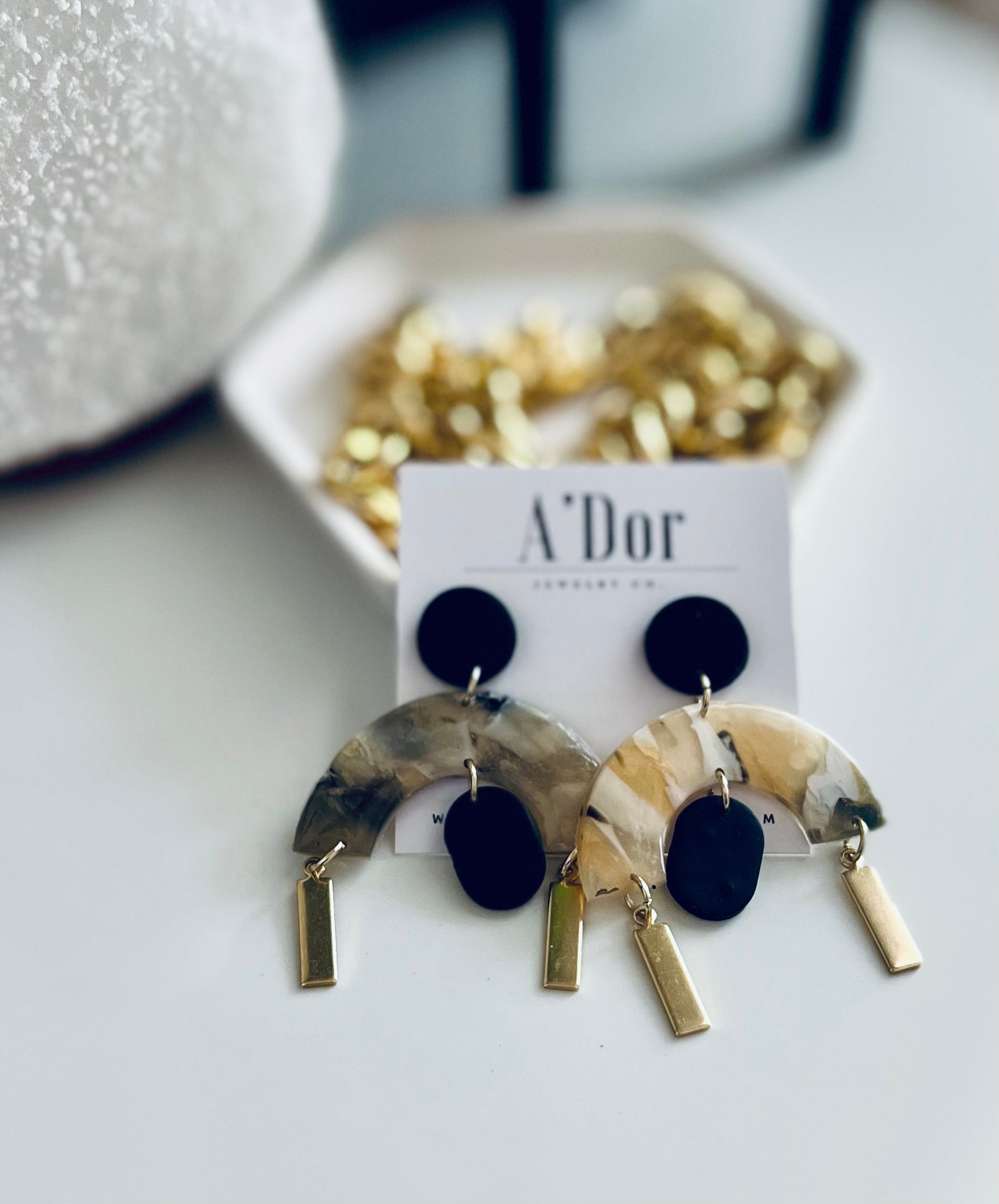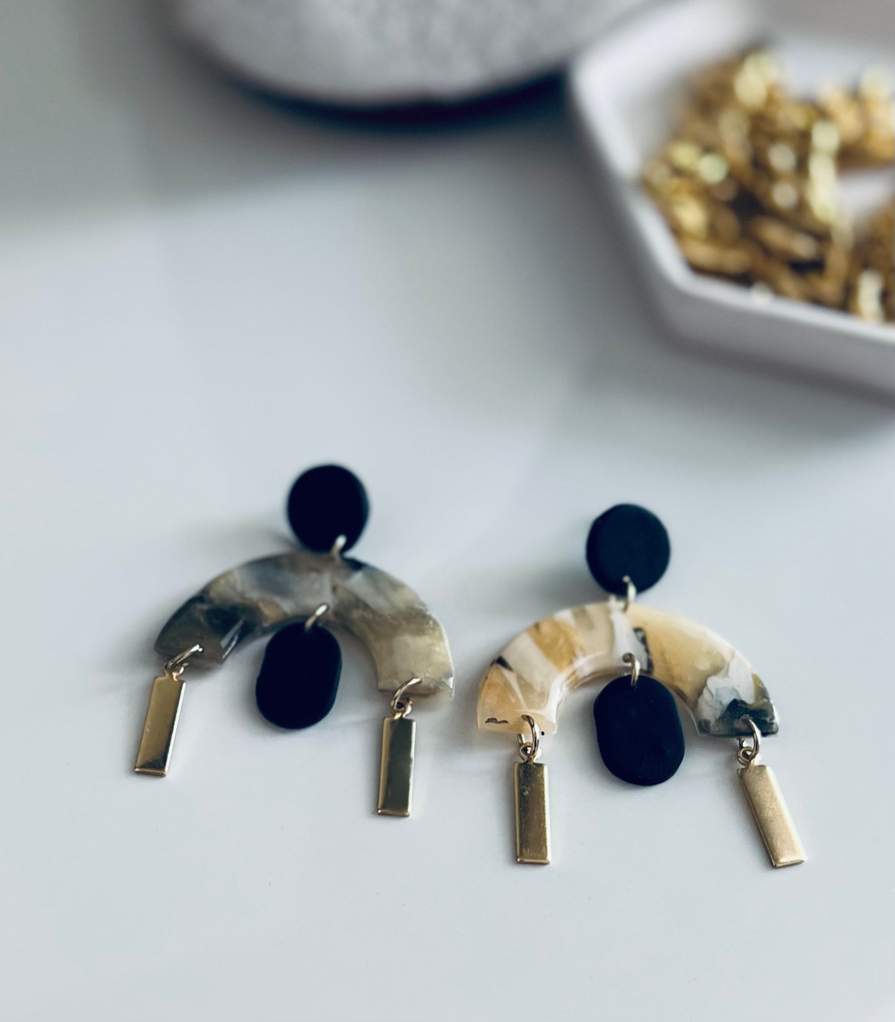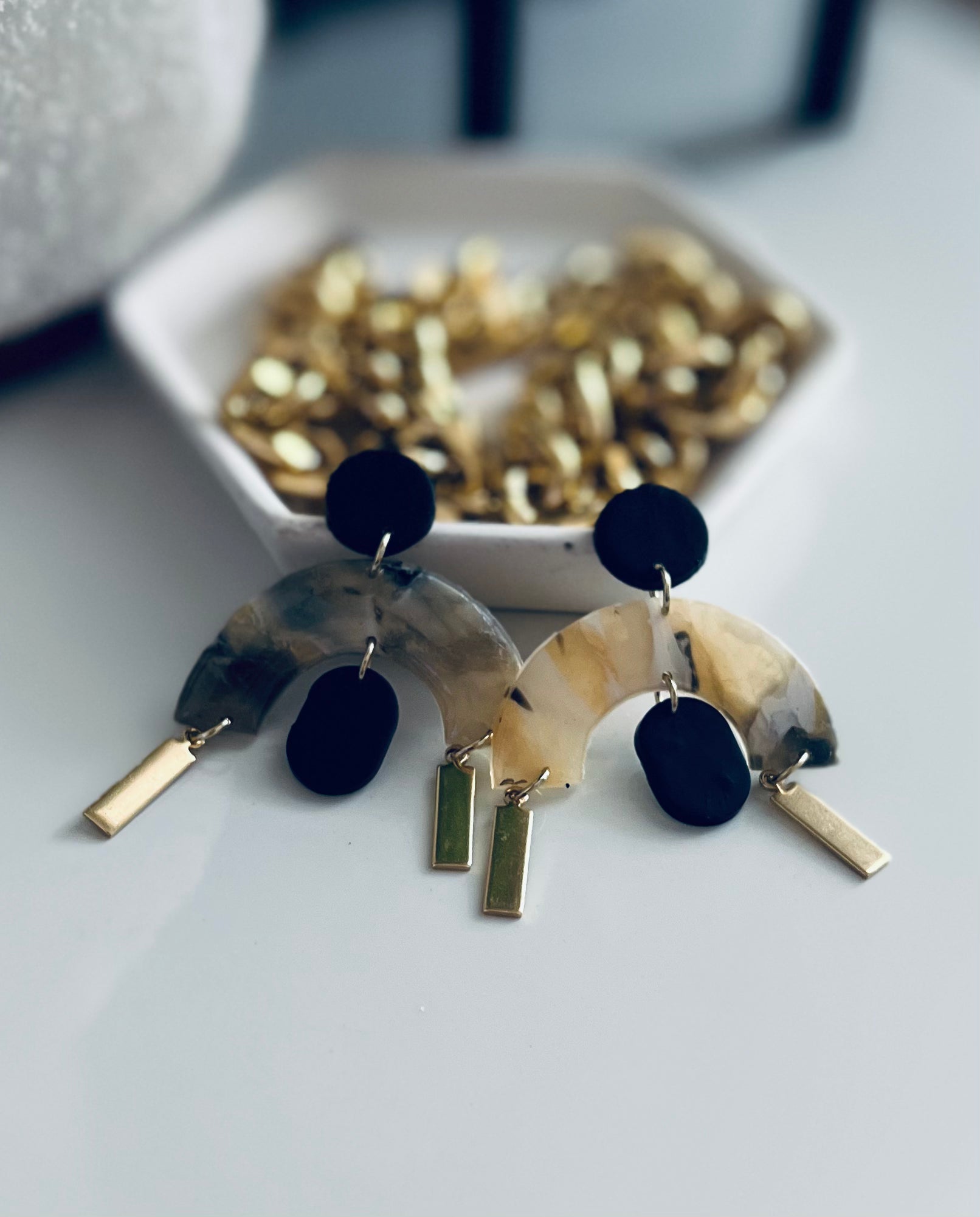 Elevate your accessory game with Jai earrings, featuring a chic arch design crafted from handmade polymer clay. Enhanced with delicate brass embellishments, these dangle earrings bring a stylish and sophisticated touch to any outfit, perfect for making a subtle yet impactful statement.