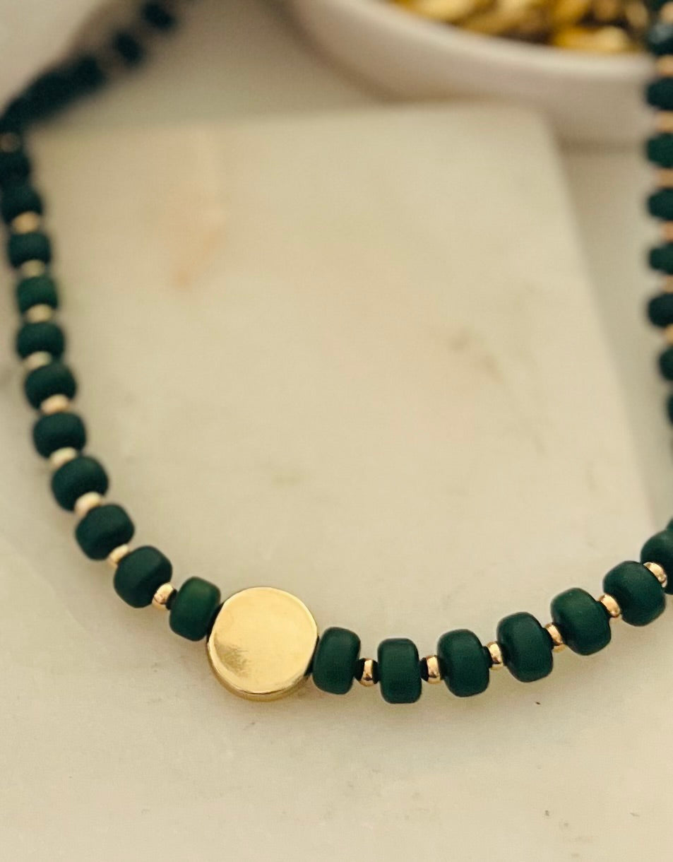 Earthy green beads meet a sleek gold coin for a look that’s effortlessly refined. The Verdant Coin Necklace is designed for everyday wear with just the right amount of polish — perfect worn solo or layered with your favorite chains. A subtle statement that feels grounded, warm, and timeless.